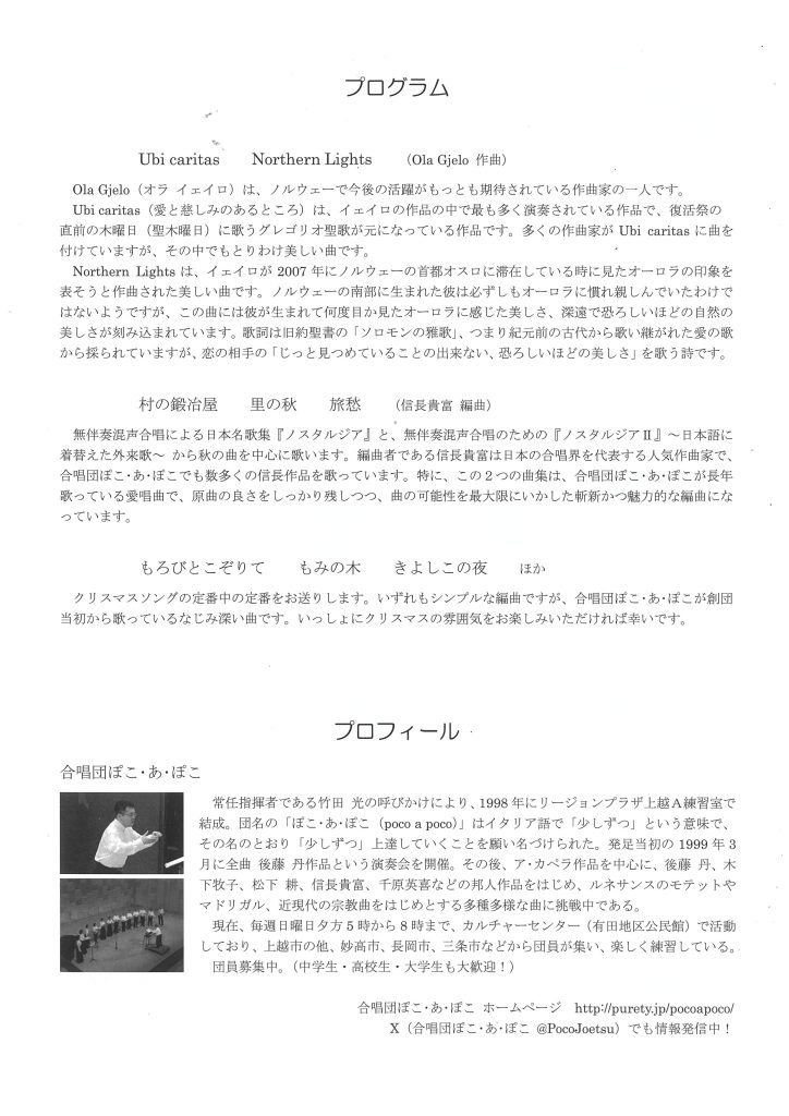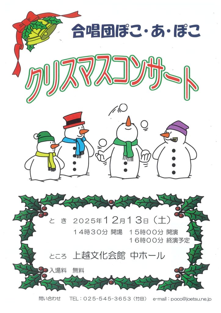 日時:2025年12月13日(土) 開演15:00 終演16:00会場:上越文化会館 中ホール料金:無料主催:合唱団ぽこ・あ・ぽこ お問い合わせ 竹田 025-545-3653