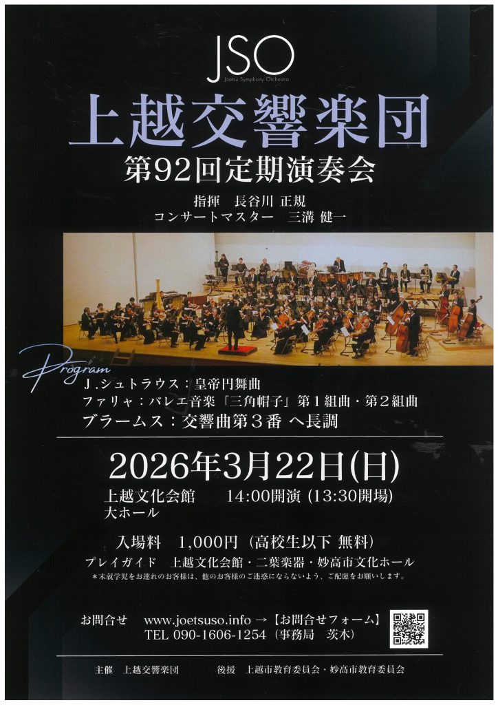 日時:2026年3月22日(日) 開場:13:30 開演:14:00会場:上越文化会館 大ホール料金:1,000円(高校生以下 無料) 上越文化会館で販売しております。主催・お問い合わせ先:上越交響楽団事務局